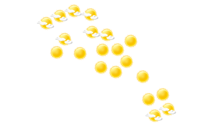 In Ogee’s wird von Tagesbeginn bis zum Nachmittag die Sonne von einzelnen Wolken verdeckt bei Werten von 24 bis zu 25°C. Abends gibt es in Ogee’s keine Wolken bei Werten von 24 bis zu 25°C. In der Nacht ist es klar bei Werten von 24°C.