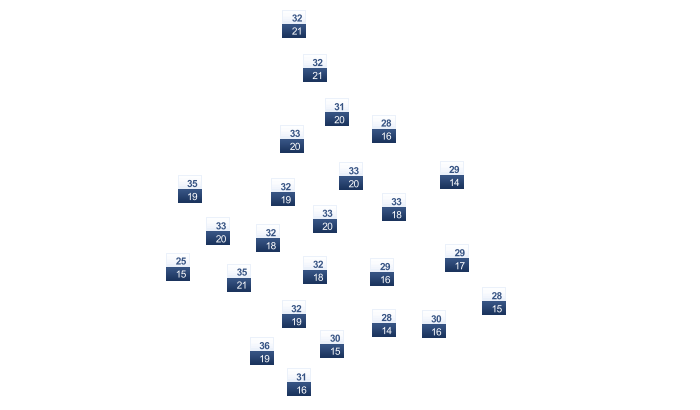 31 | 29 | 27 | 23 | 20 | 17 | 17 | 20 | 24 | 26 | 28 | 30 |