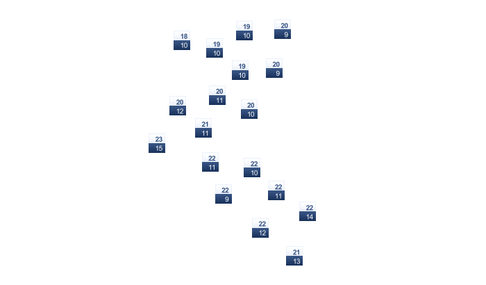 | 2 | 3 | 5 | 9 | 14 | 18 | 21 | 21 | 18 | 13 | 7 | 3 |