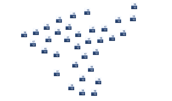 | 10 | 13 | 17 | 22 | 29 | 34 | 36 | 36 | 33 | 27 | 19 | 12 |