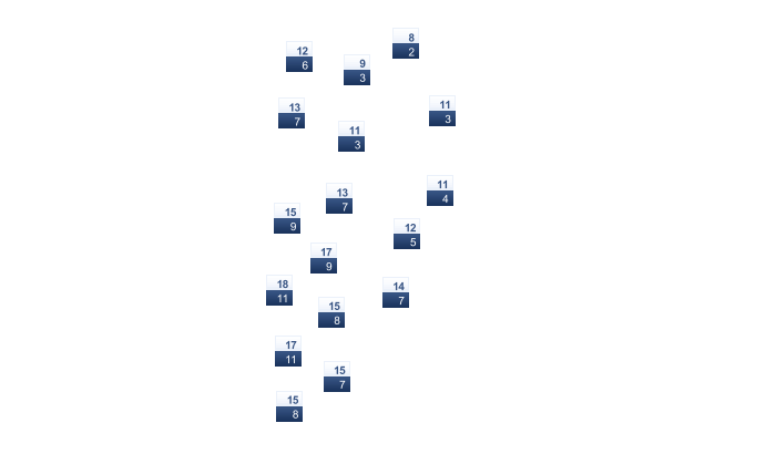 | 2 | 3 | 5 | 9 | 14 | 18 | 21 | 21 | 18 | 13 | 7 | 3 |