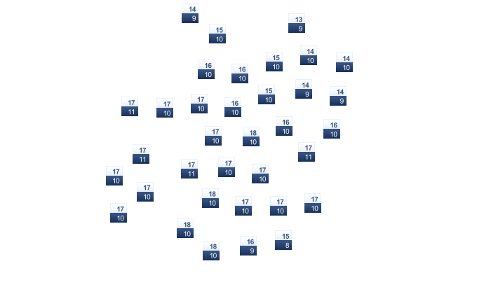 | 10 | 13 | 17 | 22 | 29 | 34 | 36 | 36 | 33 | 27 | 19 | 12 |