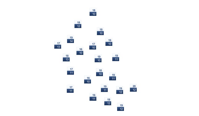 | 10 | 13 | 17 | 22 | 29 | 34 | 36 | 36 | 33 | 27 | 19 | 12 |