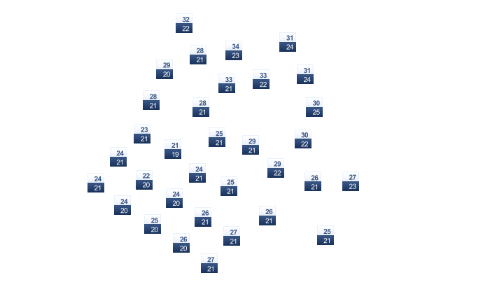 | 28 | 28 | 27 | 25 | 23 | 22 | 22 | 23 | 25 | 27 | 27 | 27 |