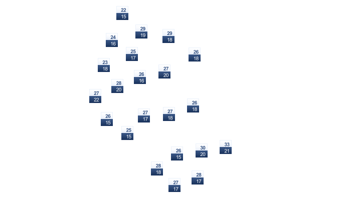 | 28 | 28 | 27 | 25 | 23 | 22 | 22 | 23 | 25 | 27 | 27 | 27 |