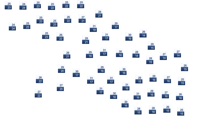| 28 | 28 | 27 | 25 | 23 | 22 | 22 | 23 | 25 | 27 | 27 | 27 |