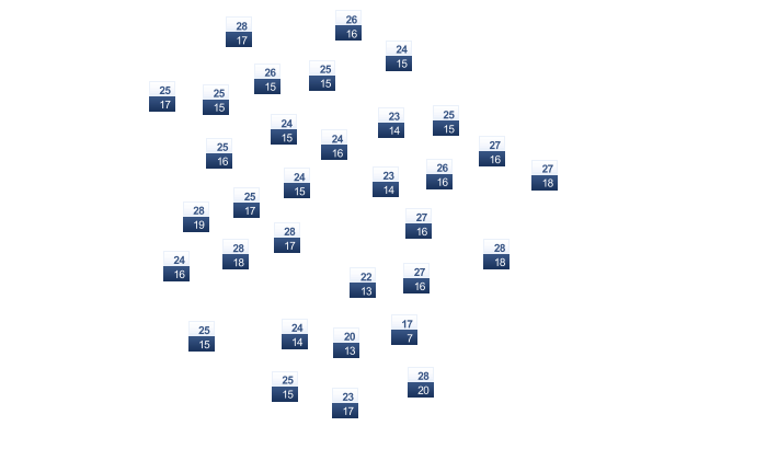 | 28 | 28 | 27 | 25 | 23 | 22 | 22 | 23 | 25 | 27 | 27 | 27 |