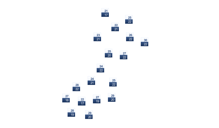 | 28 | 28 | 27 | 25 | 23 | 22 | 22 | 23 | 25 | 27 | 27 | 27 |