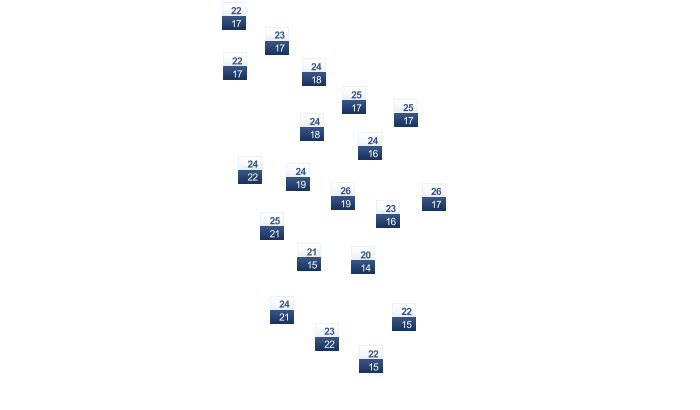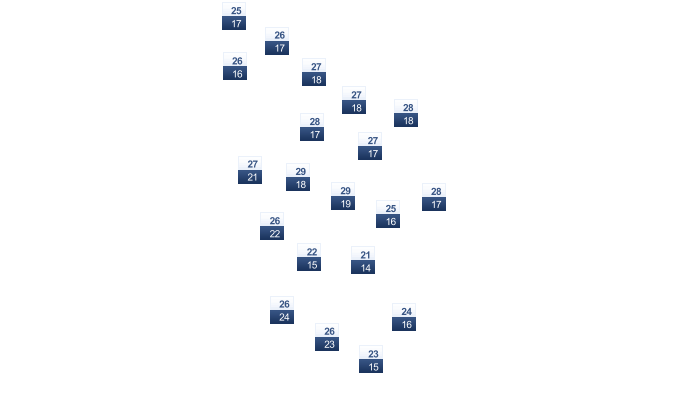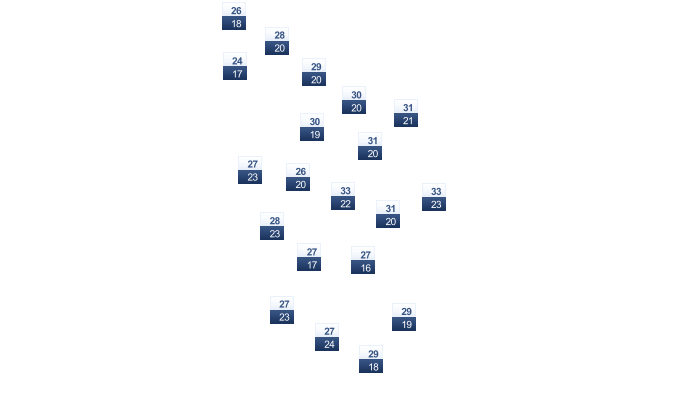 | 28 | 28 | 27 | 25 | 23 | 22 | 22 | 23 | 25 | 27 | 27 | 27 |