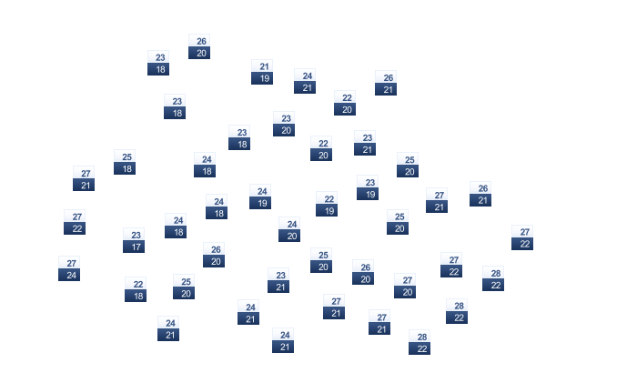 | 28 | 28 | 27 | 25 | 23 | 22 | 22 | 23 | 25 | 27 | 27 | 27 |