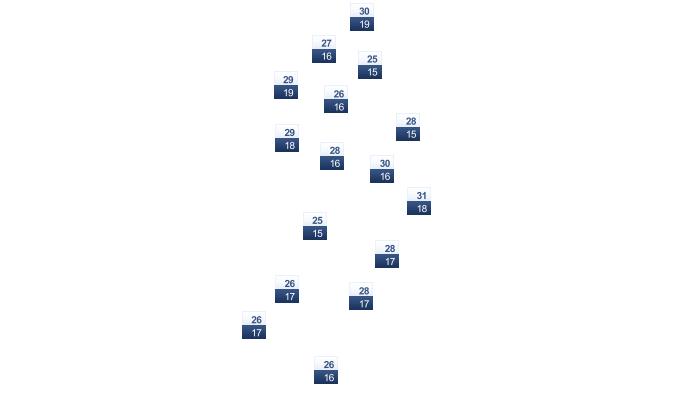 | 28 | 28 | 27 | 25 | 23 | 22 | 22 | 23 | 25 | 27 | 27 | 27 |