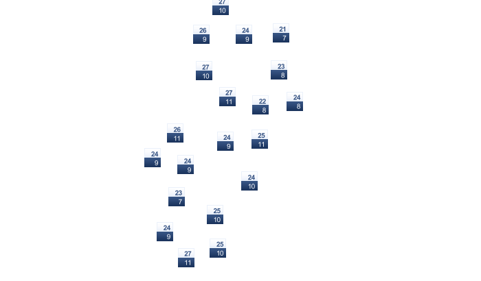 | 21 | 23 | 25 | 26 | 26 | 25 | 25 | 25 | 25 | 24 | 23 | 21 |