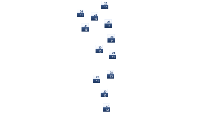 | 21 | 23 | 25 | 26 | 26 | 25 | 25 | 25 | 25 | 24 | 23 | 21 |
