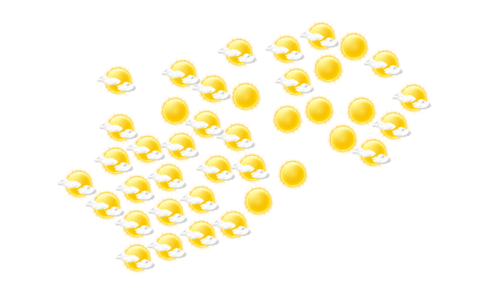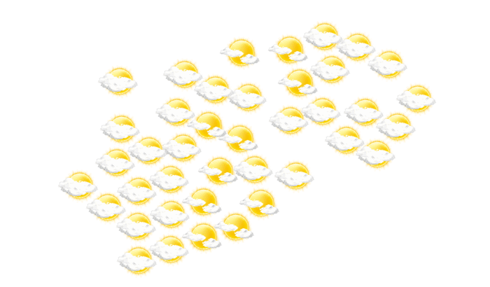 In Benoy ziehen morgens Wolkenfelder durch bei Temperaturen von 23°C. Darüber hinaus gibt es von mittags bis zum Abend hin eine Mischung aus Sonne und Wolken bei Werten von 28 bis zu 38°C. Nachts gibt es keine Wolken und die Sterne sind klar zu erkennen und die Werte gehen auf 21°C zurück.