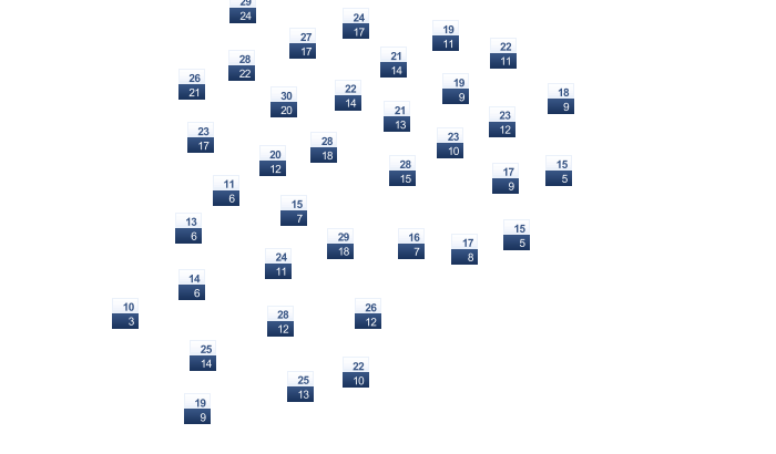 14 | 16 | 19 | 23 | 28 | 32 | 34 | 35 | 33 | 29 | 23 | 17 |