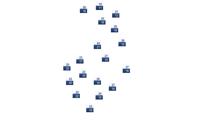 14 | 16 | 19 | 23 | 28 | 32 | 34 | 35 | 33 | 29 | 23 | 17 |