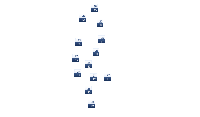 | 17 | 18 | 20 | 22 | 25 | 27 | 31 | 31 | 30 | 26 | 22 | 18 |