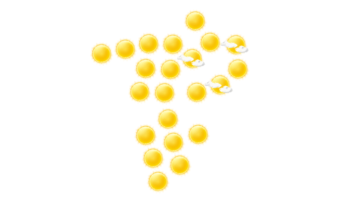 In Tataouine strahlt morgens die Sonne bei Werten von 10°C. Im weiteren Tagesverlauf verdecken einzelne Wolken die Sonne bei Höchstwerten von 22°C. Am Abend gibt es in Tataouine einen wolkenlosen Himmel bei Werten von 16 bis zu 20°C. In der Nacht ist es wolkenlos bei Werten von 14°C. Böen können Geschwindigkeiten zwischen 9 und 24 km/h erreichen.