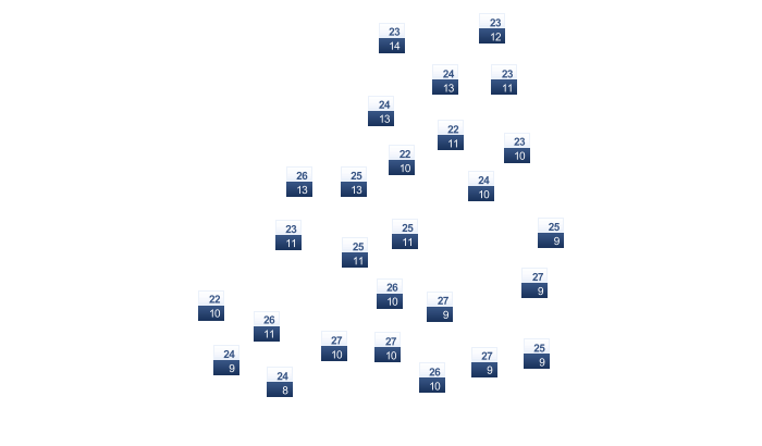 | 17 | 18 | 20 | 22 | 25 | 27 | 31 | 31 | 30 | 26 | 22 | 18 |
