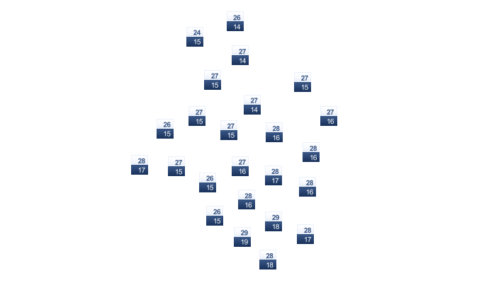 | 17 | 18 | 20 | 22 | 25 | 27 | 31 | 31 | 30 | 26 | 22 | 18 |