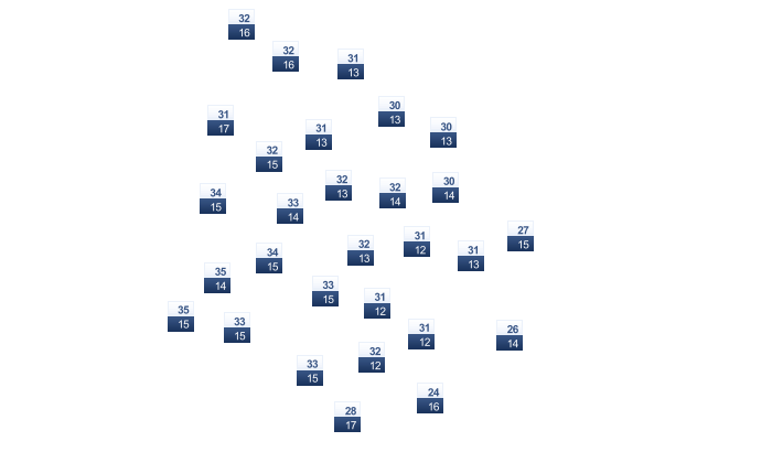 | 33 | 32 | 29 | 25 | 22 | 19 | 19 | 21 | 22 | 24 | 29 | 32 |