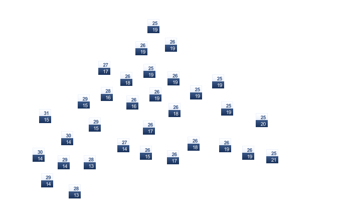 | 33 | 32 | 29 | 25 | 22 | 19 | 19 | 21 | 22 | 24 | 29 | 32 |