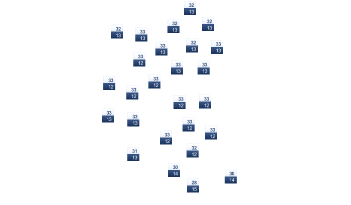 | 33 | 32 | 29 | 25 | 22 | 19 | 19 | 21 | 22 | 24 | 29 | 32 |