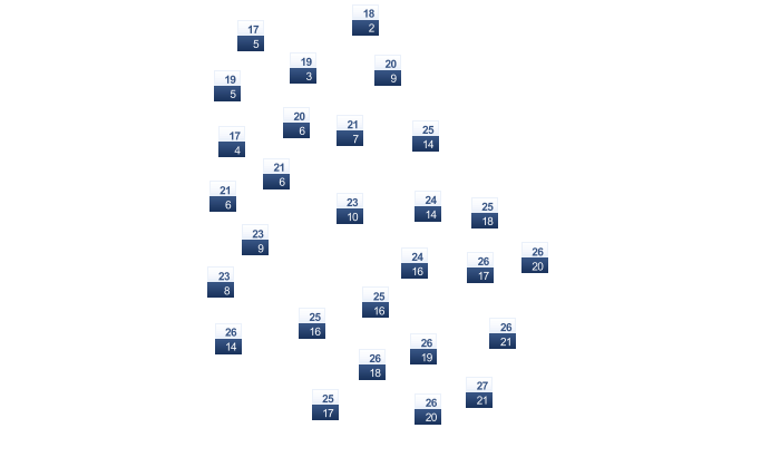 | 8 | 11 | 15 | 21 | 27 | 32 | 33 | 32 | 29 | 22 | 14 | 9 |