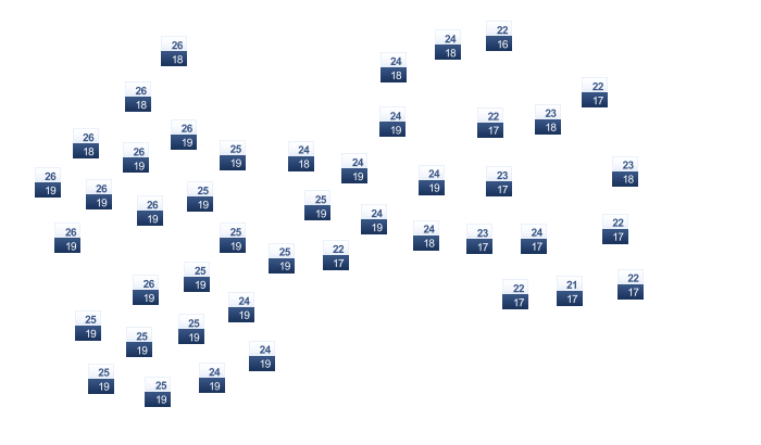 | 19 | 20 | 21 | 23 | 24 | 25 | 25 | 25 | 24 | 23 | 22 | 20 |