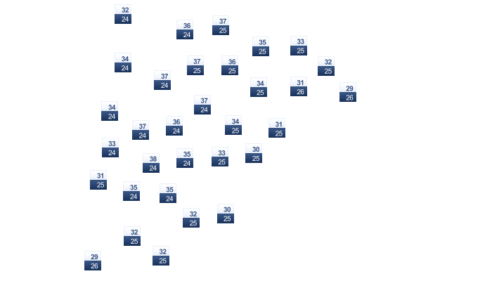 | 24 | 26 | 27 | 30 | 33 | 34 | 34 | 34 | 31 | 28 | 27 | 25 |