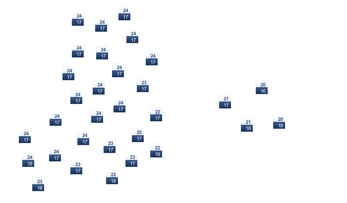 | 24 | 26 | 27 | 30 | 33 | 34 | 34 | 34 | 31 | 28 | 27 | 25 |