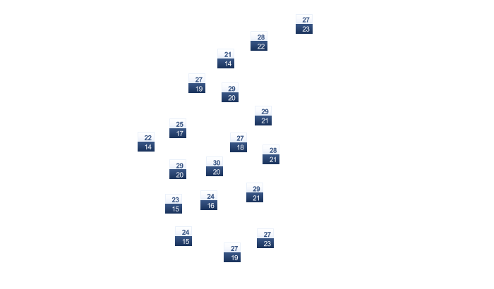 | 24 | 26 | 27 | 30 | 33 | 34 | 34 | 34 | 31 | 28 | 27 | 25 |