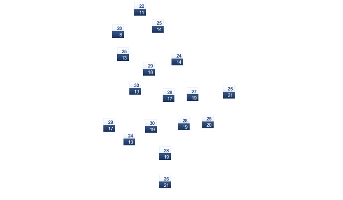 | 24 | 26 | 27 | 30 | 33 | 34 | 34 | 34 | 31 | 28 | 27 | 25 |