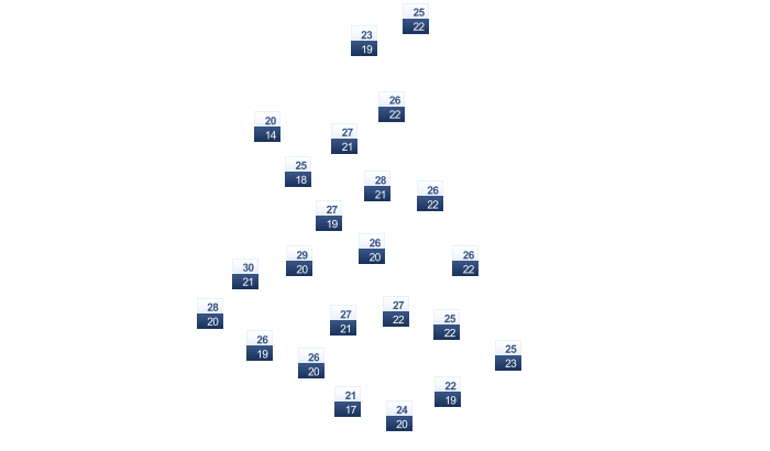 | 19 | 20 | 21 | 23 | 24 | 25 | 25 | 25 | 24 | 23 | 22 | 20 |