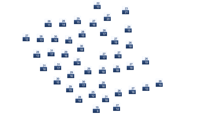 | 24 | 26 | 27 | 30 | 33 | 34 | 34 | 34 | 31 | 28 | 27 | 25 |