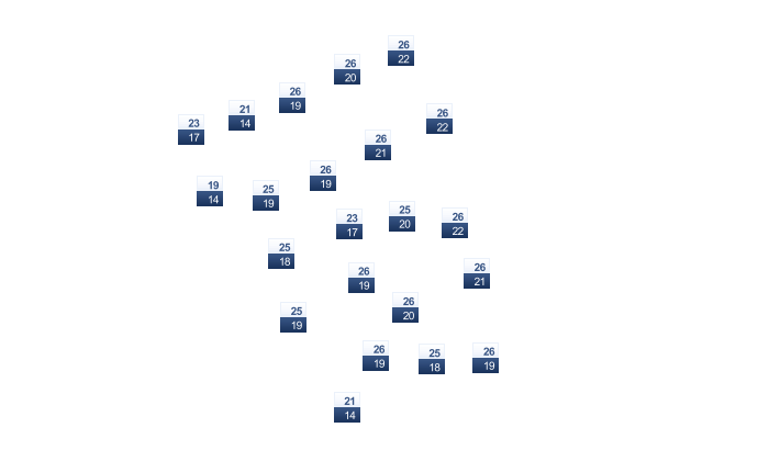 | 19 | 20 | 21 | 23 | 24 | 25 | 25 | 25 | 24 | 23 | 22 | 20 |
