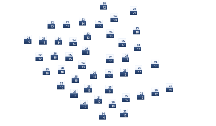 | 24 | 26 | 27 | 30 | 33 | 34 | 34 | 34 | 31 | 28 | 27 | 25 |