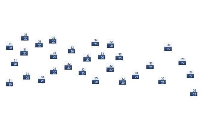 | 24 | 26 | 27 | 30 | 33 | 34 | 34 | 34 | 31 | 28 | 27 | 25 |