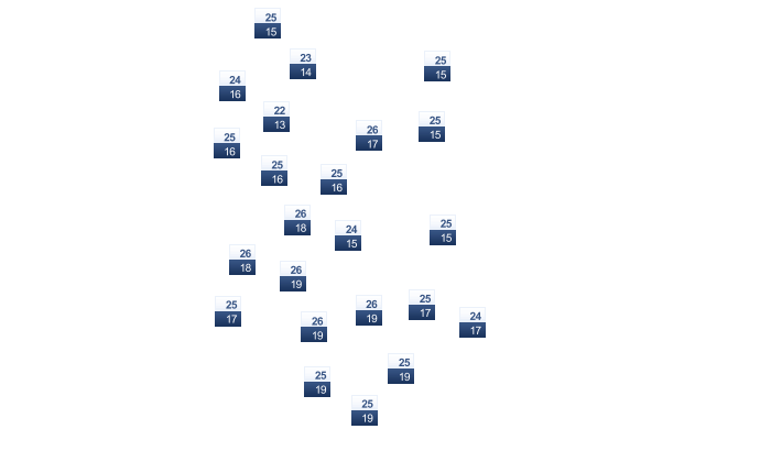| 19 | 20 | 21 | 23 | 24 | 25 | 25 | 25 | 24 | 23 | 22 | 20 |