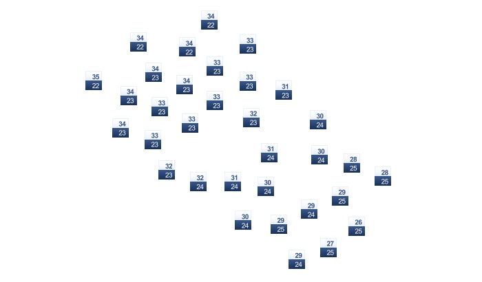 | 24 | 26 | 27 | 30 | 33 | 34 | 34 | 34 | 31 | 28 | 27 | 25 |