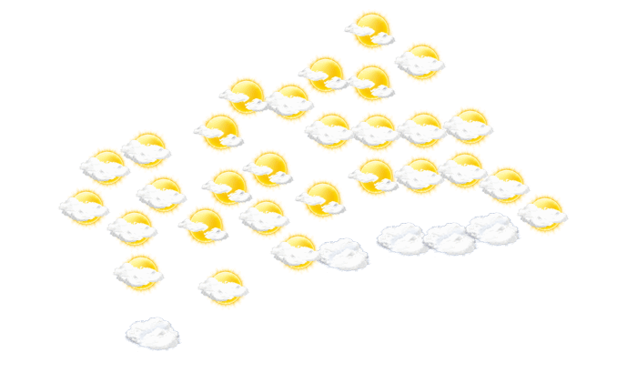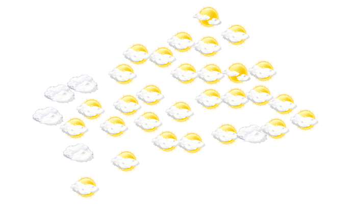 In Dédengué kommt es von morgens bis zum Nachmittag zu einem Mix aus Sonne und Wolken bei Werten von 23 bis zu 32°C. Abends gibt es in Dédengué überwiegend blauen Himmel mit vereinzelten Wolken bei Werten von 26 bis zu 28°C. Nachts ist es bewölkt, die Sterne sind nur vereinzelt zu sehen bei einer Temperatur von 23°C.