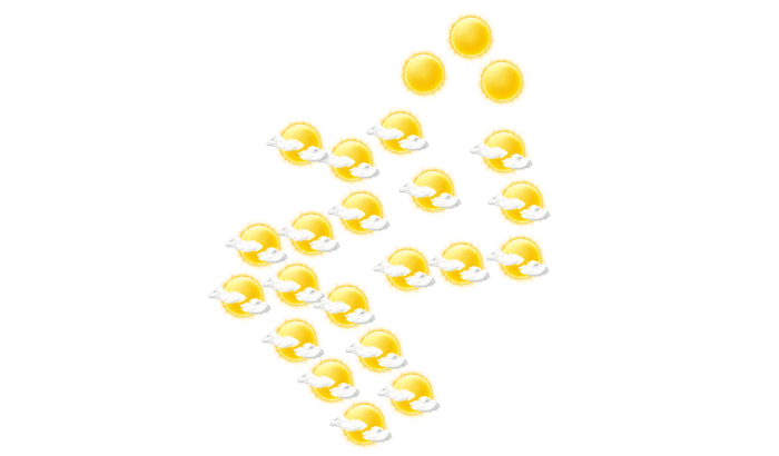 In Ippy gibt es am Morgen keine Wolken, die Sonne scheint und die Temperatur liegt bei 20°C. Am Mittag gibt es lockere Bewölkung bei Höchstwerten von 38°C. Abends gibt es in Ippy einen wolkenlosen Himmel und die Temperaturen liegen zwischen 26 und 29 Grad. Nachts ist es klar bei Tiefsttemperaturen von 20°C.