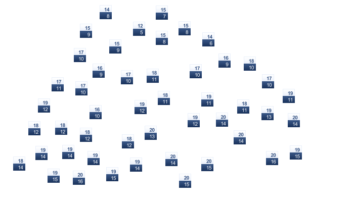 | 15 | 17 | 19 | 23 | 27 | 31 | 34 | 34 | 32 | 28 | 22 | 17 |