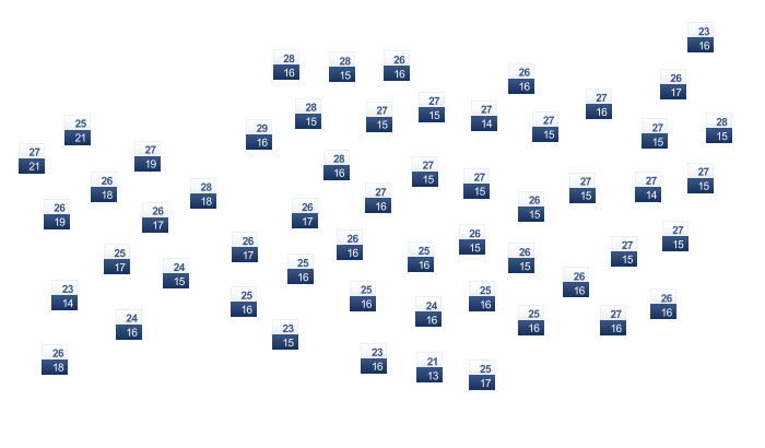 | 15 | 17 | 19 | 23 | 27 | 31 | 34 | 34 | 32 | 28 | 22 | 17 |